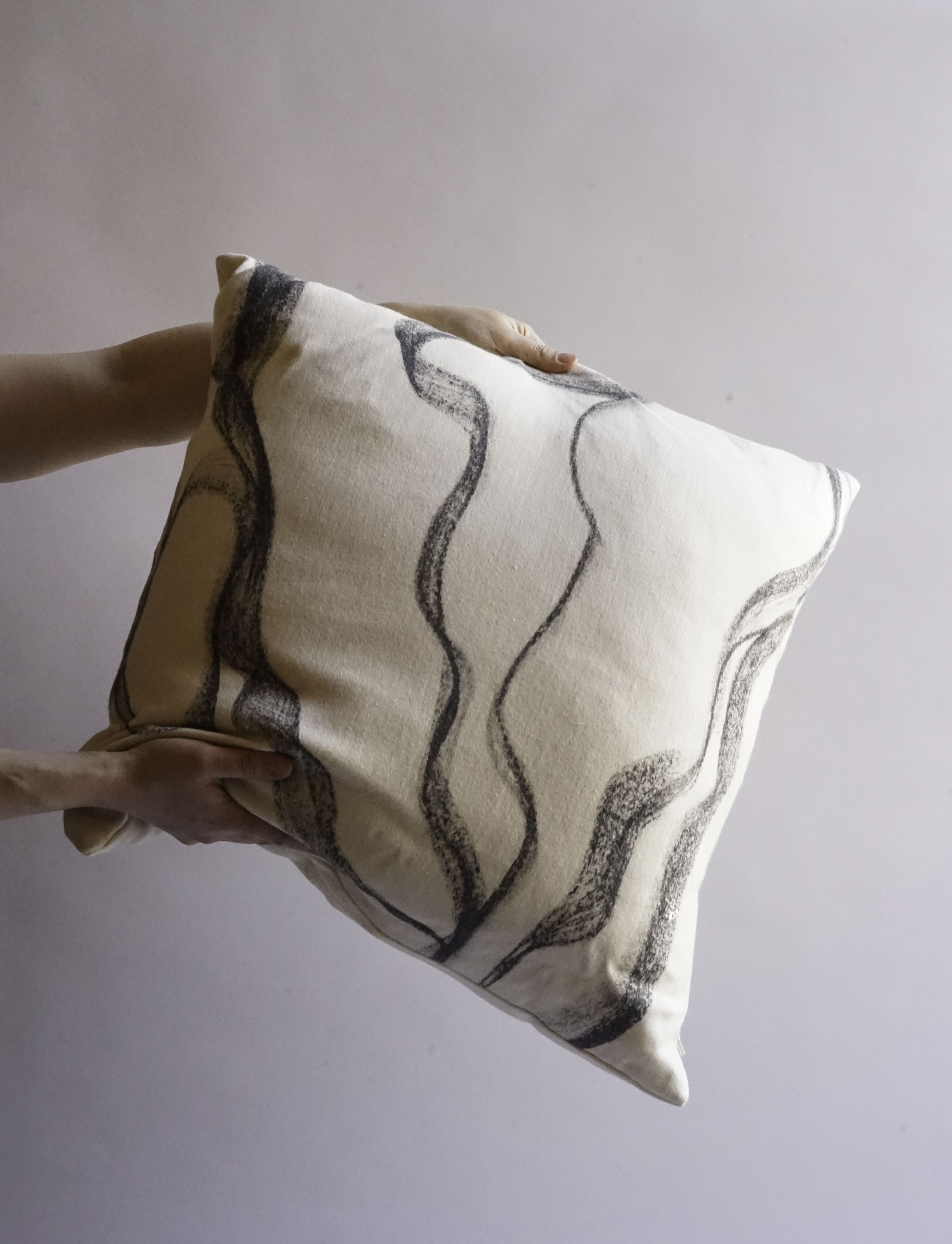 These freeform, hand-painted cushions, softly depict stacking and standing stones, on wool or linen-cotton blend bases. Originally painted as large landscape textiles, they’ve then been divided the painting into series of square and rectangular cushions, each bearing her brush marks as an abstract echo of the full composition they once belonged to.