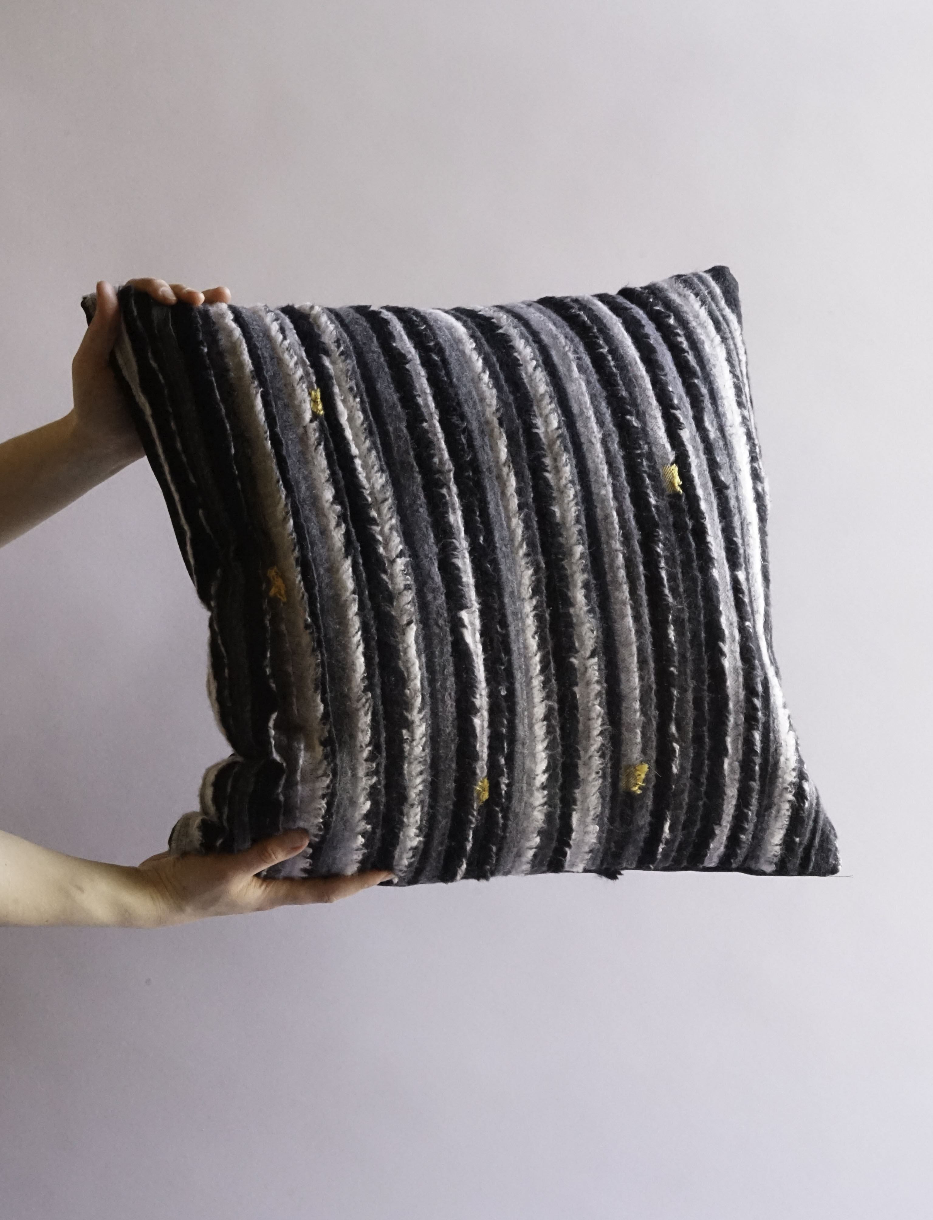 These cushions have been created using selvedge from a Scottish cashmere mill, turning a by-product from their manufacturing into seductively stroke-able cushions. The cashmere strips are stitched into a black wool base and interspersed with gold tabs. The effect is like sedimentary rock with glints of gold embedded within.